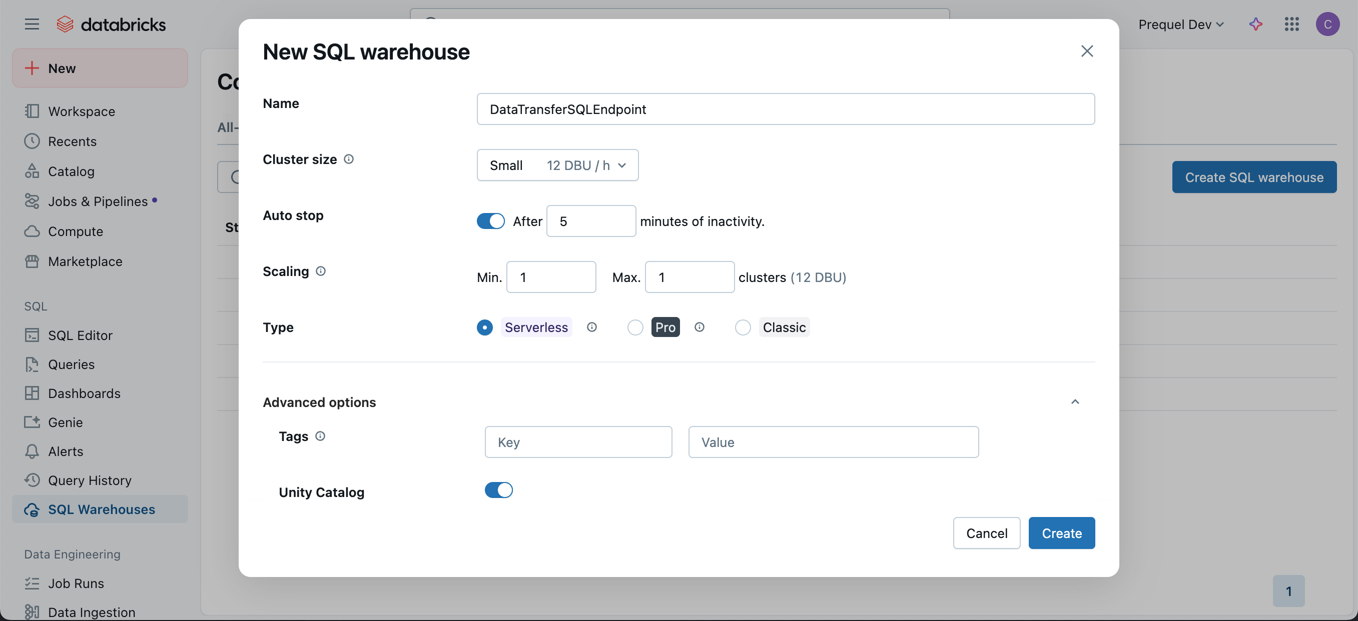 - In the New SQL Warehouse menu, choose a Name and configure the options for the new SQL warehouse. Under "Advanced options" ensure "Unity Catalog" is in the On position and click Create.
