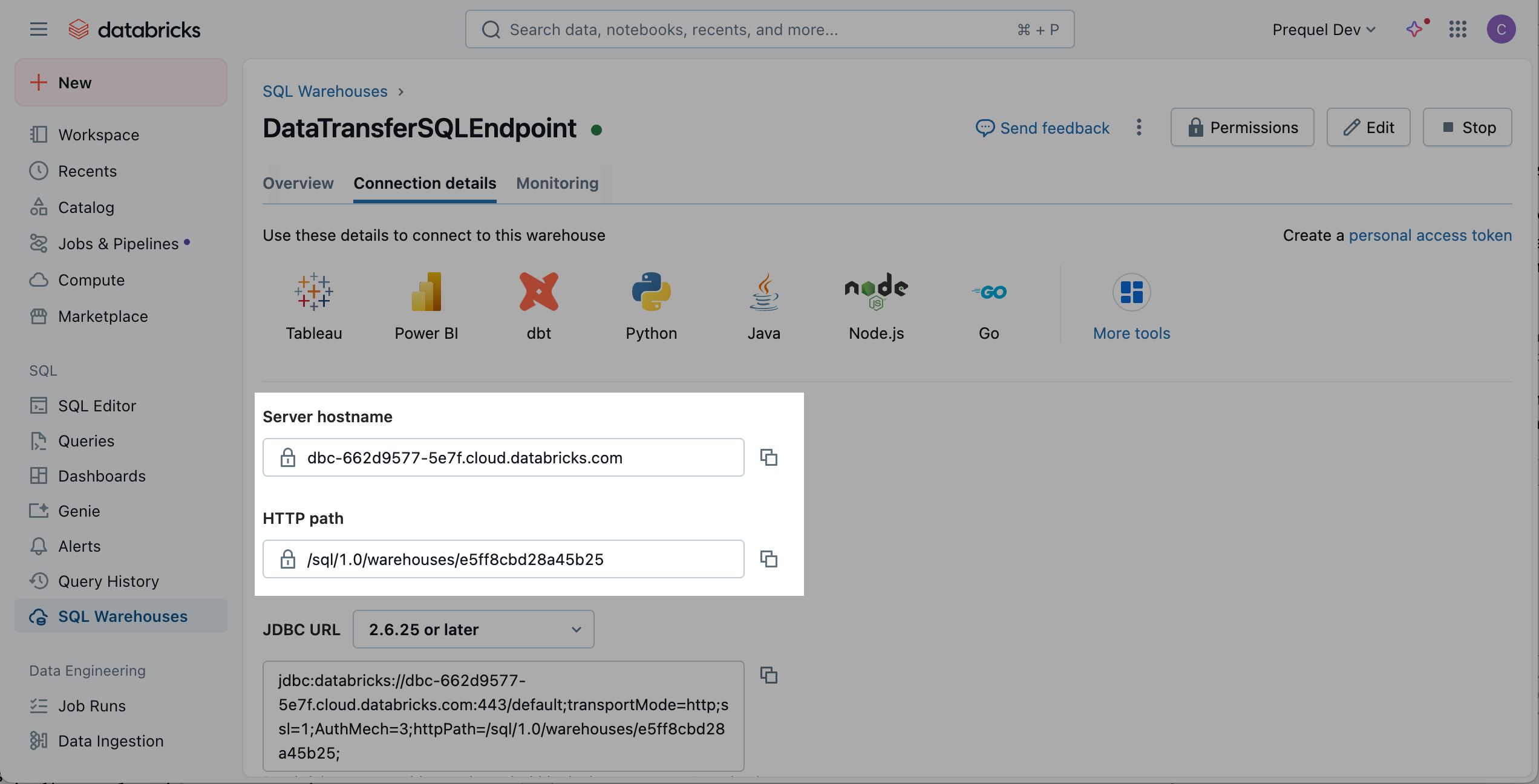 - In the SQL Warehouses console, select the SQL warehouse you created in Step 1.